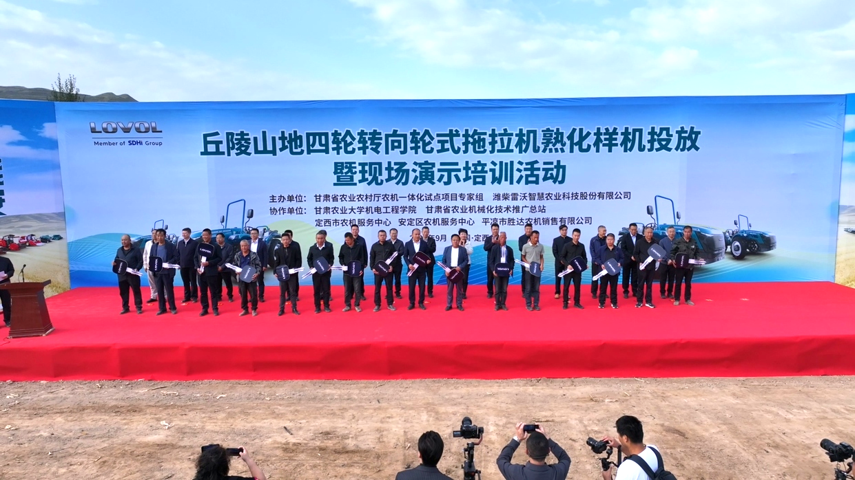 9月16日,在甘肃省农机研发制造推广应用一体化项目活动现场,60台雷沃F704-3U丘陵山区四轮转向轮式拖拉机正式交付使用。甘肃省农业农村厅、定西市政府、甘肃省农机研产推用一体化农机农艺专家组、潍柴雷沃智慧农业等单位相关领导出席活动。