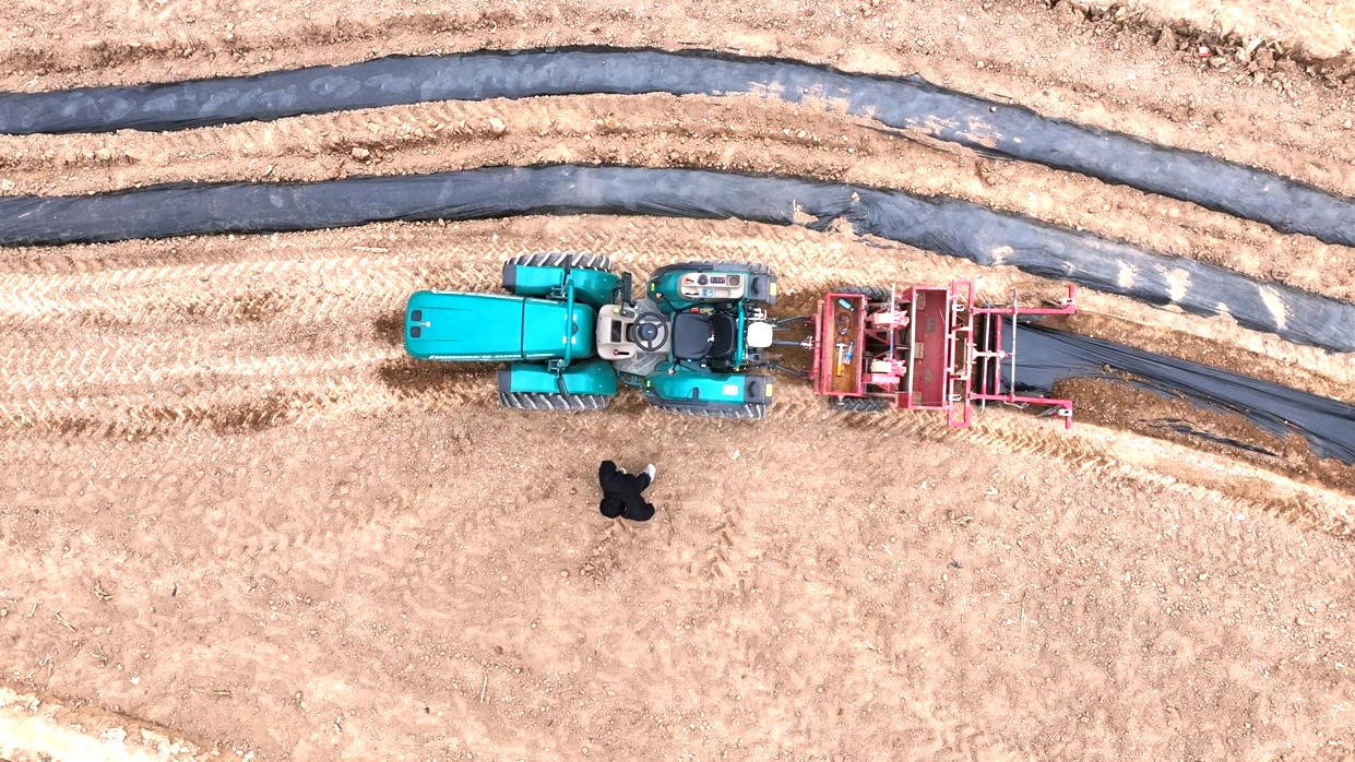 “曲线导航演示”环节,拖拉机沿预设曲线路径自主完成马铃薯覆膜作业,确保曲线地块作业精准、行距均匀,为后续田间管理、收获环节打好基础。