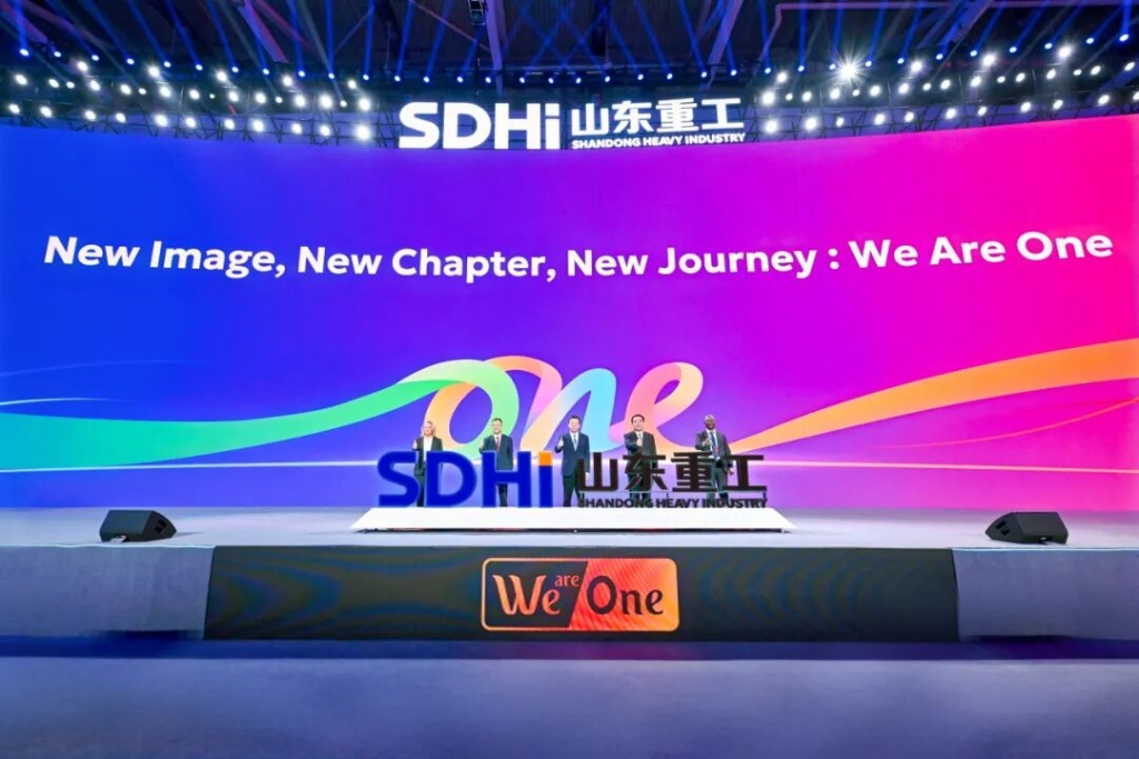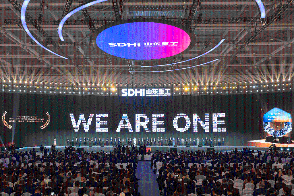 大会正式发布山东重工全球品牌标识,任刚、满慎刚、王志坚和战略合作伙伴代表、海外员工代表共同为品牌标识揭幕。