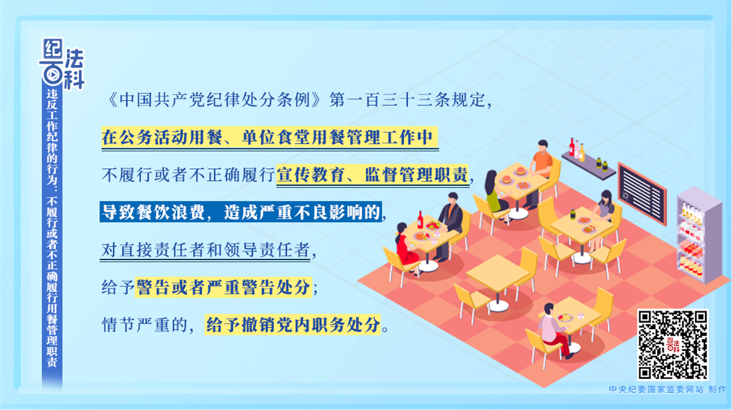 《中国共产党纪律处分条例》第一百三十三条规定,在公务活动用餐、单位食堂用餐管理工作中不履行或者不正确履行宣传教育、监督管理职责,导致餐饮浪费,造成严重不良影响的,对直接责任者和领导责任者,给予警告或者严重警告处分;情节严重的,给予撤销党内职务处分。