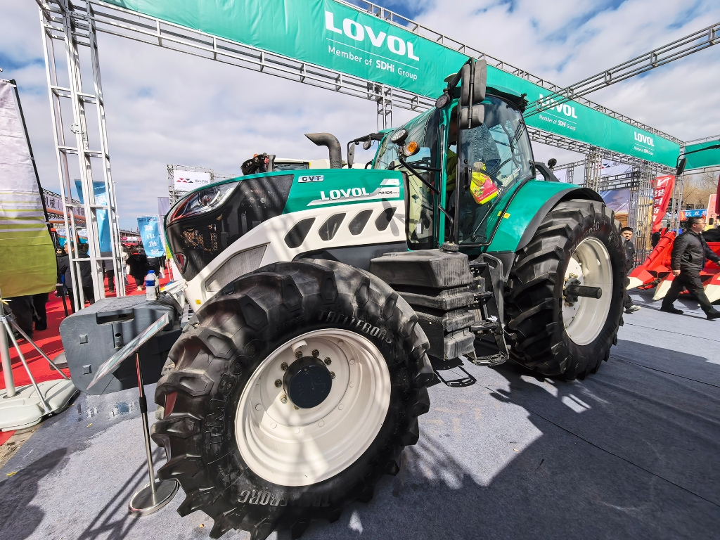 拖拉机展区,雷沃智能拖拉机依次列阵,从动力澎湃的M系列拖拉机到代表无级变速前沿科技的CVT系列旗舰机型,全面满足黑土地规模化、集约化的作业需求。